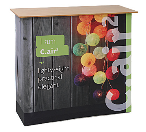 Le comptoir portatif C.AIR2 est un nouveau compotoir portatif offrant le plus de possibilité au meilleur prix. En Effet, grâce à sa structure pliable d'aluminium et son visuel tissu, il se monte en 3 minutes seulement avec une tablette interne incluse et un top en bamboo clair.