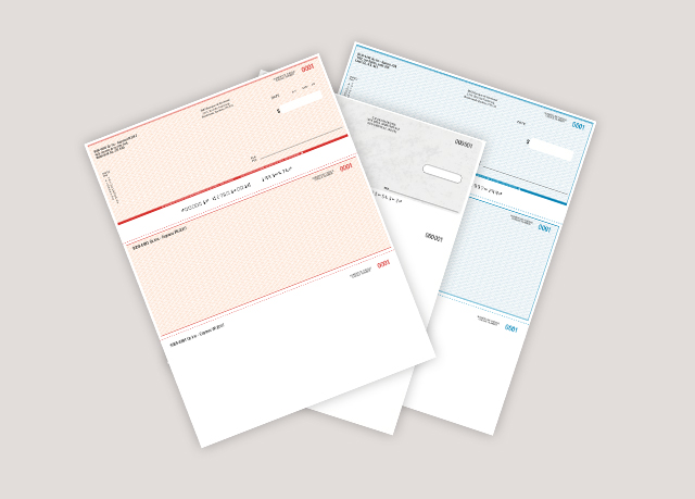 Chèques format 8.5x11 po. sur papier sécurité P50M-Securitek - imprimés 2 couleurs recto (noir et 1 PMS au choix) + noir au verso + encre magnétique noir recto pour infos de la banque et code MICR et numérotation en rouge de 3 numéros.