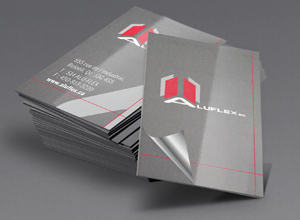 Cartes d'affaires imprimés pleines couleurs des 2 côtés (4/4 CMYK) + une 5e couleur argent métallique (PMS 877) sur carton 16 pts C2C avec une lamination matte recto-verso.