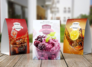 Petite Tente de table imprimé pleines couleurs recto (4/0 CMYK) + vernis aqueux lustré sur carton 14 pts C2C avec ligne de scorage et découpe à la matrice. Le produit final est livré à plat, non-assemblé